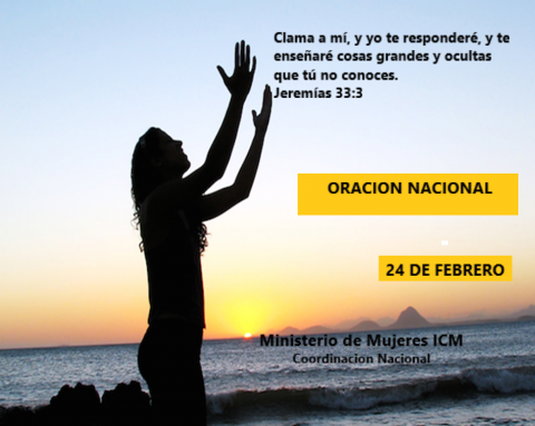 En nuestro plan de acción del ministerio de mujeres hemos programado un día de Oración Nacional el día 24 de Febrero. El objetivo es Pidiendo guía y dirección en las proyecciones de nuestro ministerio en este año. Y por nuestra ICM Etiquetas Distrito Litoral Distrito Sabanas Distrito Valle del Cauca Distrito Eje Cafetero